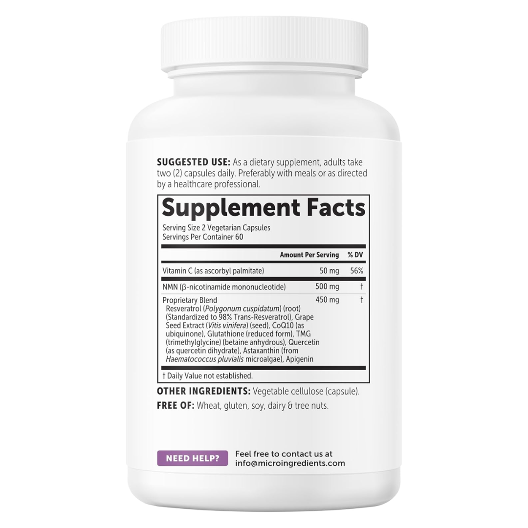 - Proprietary blend 450 mg including trans resveratrol 98 percent, apigenin, CoQ10, grape seed extract, glutathione, TMG, astaxanthin, quercetin